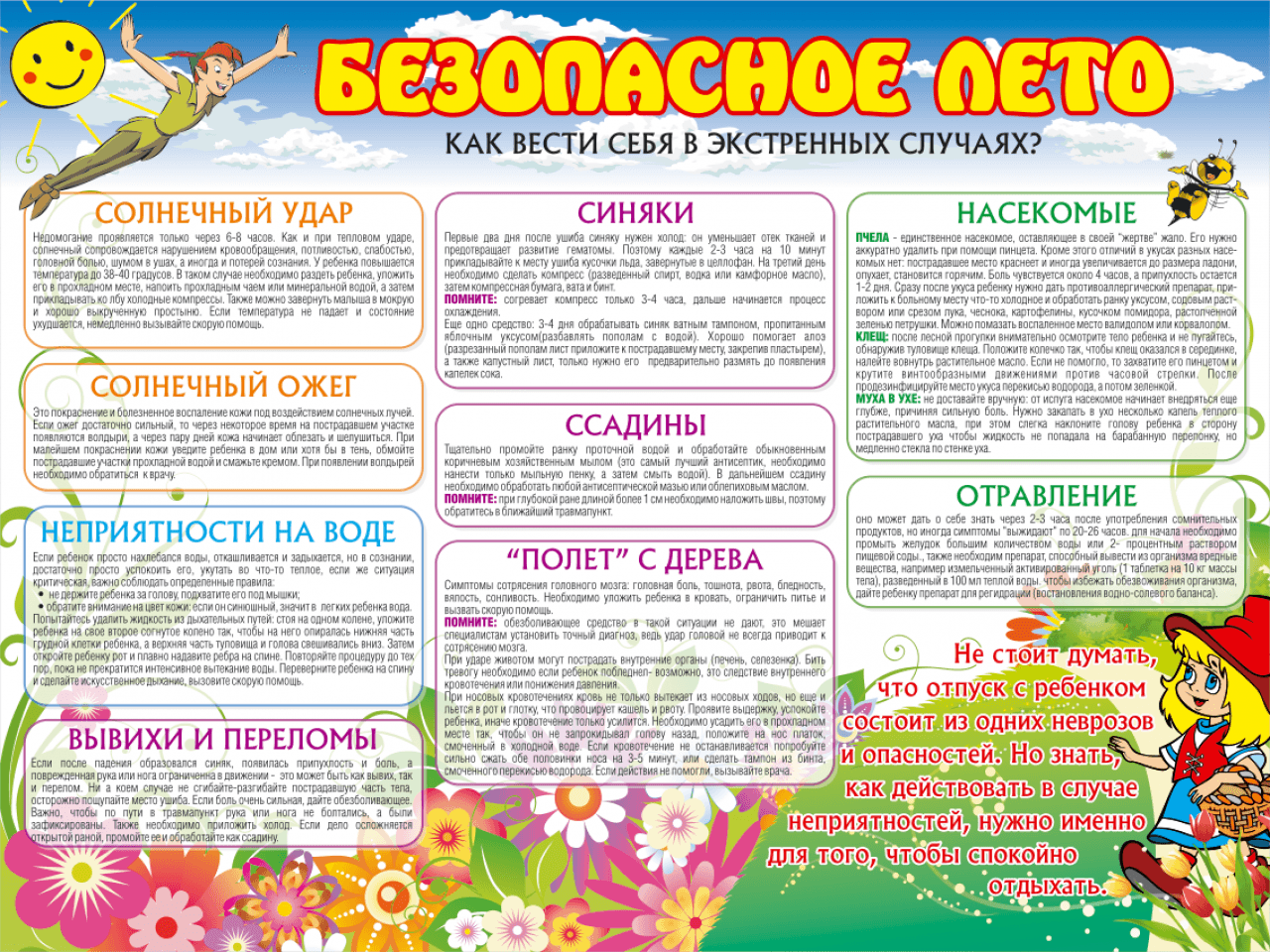 Лето — самое короткое и долгожданное время года для детей и их родителей. Пока есть возможность, хочется успеть всё: вволю погулять, искупаться, покататься на велосипеде, и заняться другими увлекательными делами, на которые зимой никогда не хватает времени. А чтобы долгие каникулы не омрачились травмами и болезнями — достаточно соблюдать правила безопасности летом для детей: и взрослым, и, конечно, самим детям. Лето характеризуется нарастанием двигательной активности и увеличением физических возможностей ребёнка, которые, сочетаясь с повышенной любознательностью и стремлением к самостоятельности, нередко приводят к возникновению опасных ситуаций.